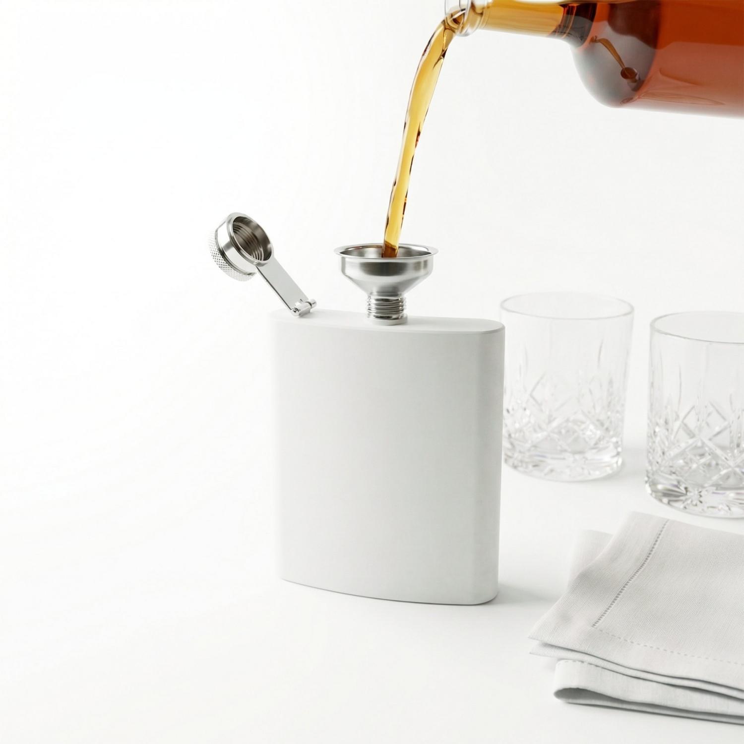 A classic companion for special moments. The Ace Flask pairs timeless stainless steel construction with a compact format designed for gifting or portable use. Recycled Stainless Steel: Durable stainless steel body. Portable Capacity: Holds 200 ml / 6.8 oz. Included Accessory: Stainless steel funnel for easy filling. Gift-Ready Packaging: Two-piece presentation box. 5.2500″ L x 1.8750″ W x 8.5000″ H