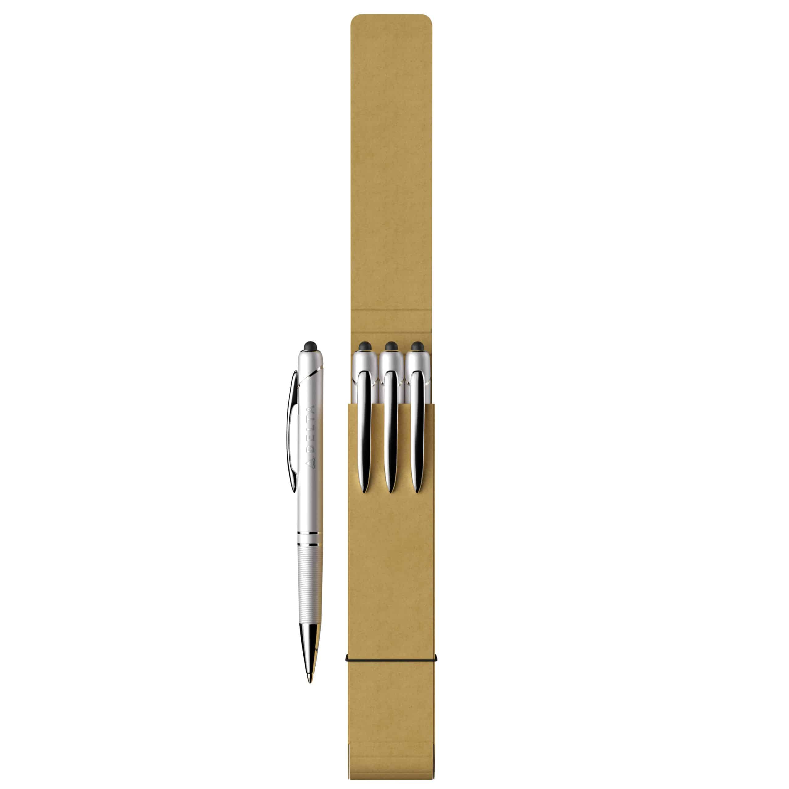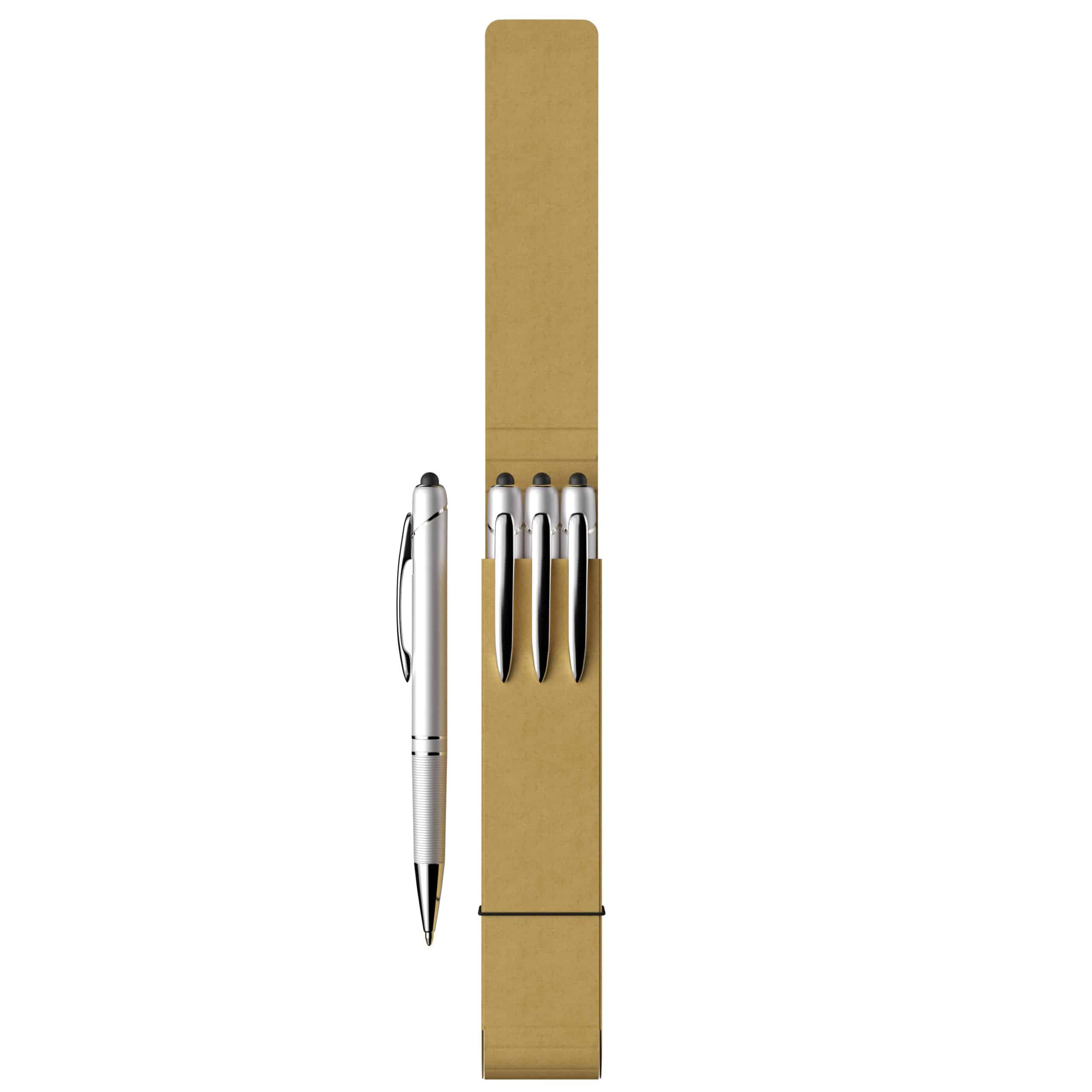 A collection of three Glacio Ballpoint Stylus Pens, presented in a recycled pen case. ComponentsEC573′,’I128. 6.2500″ L x 1.2500″ W x 0.6800″ H