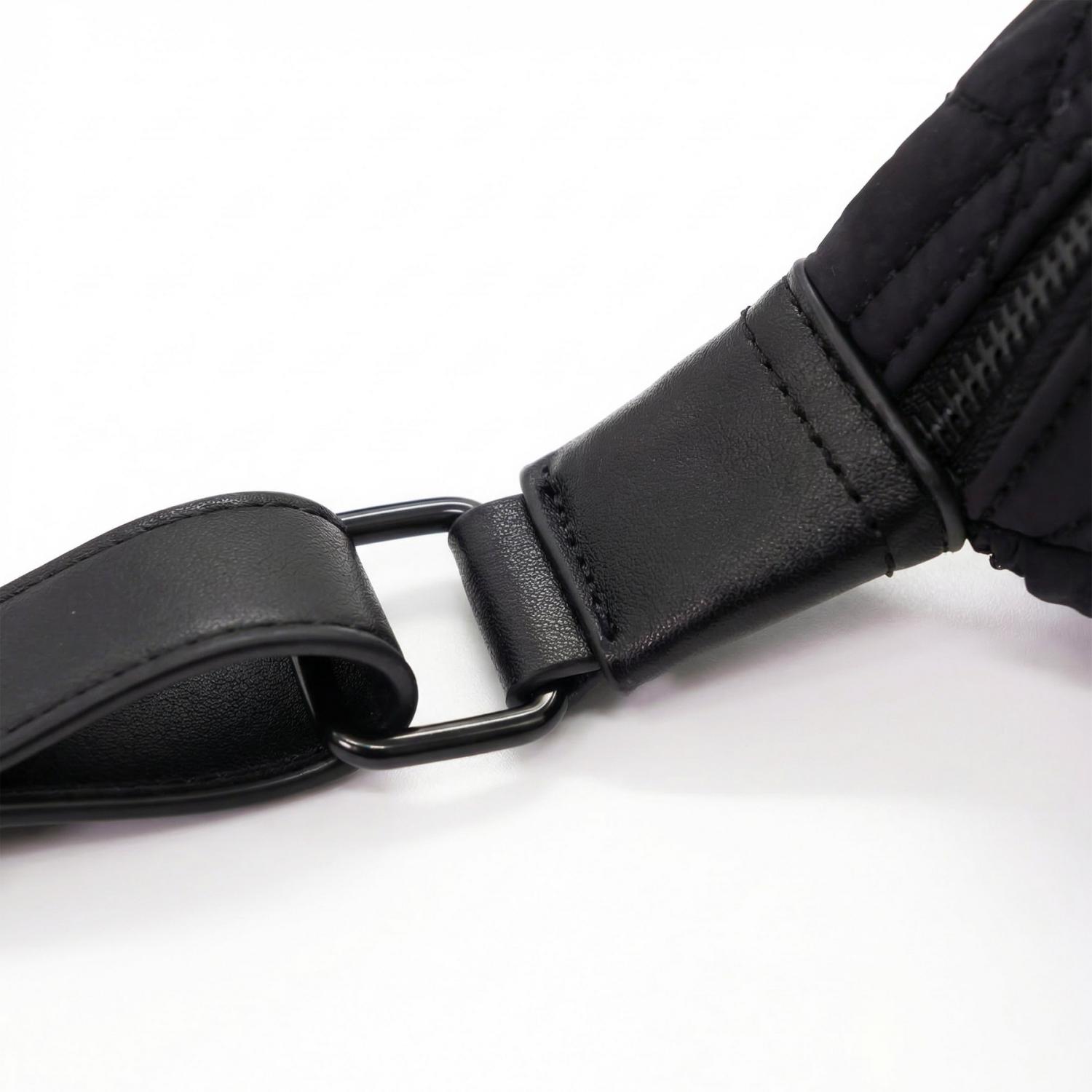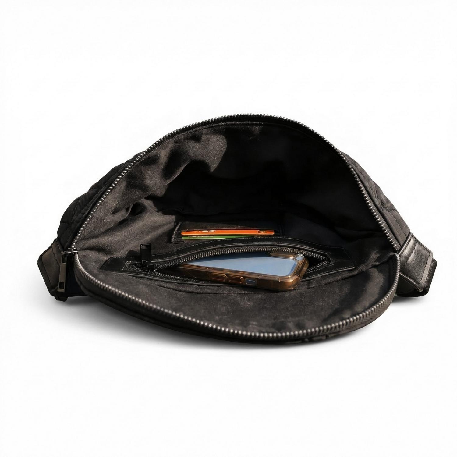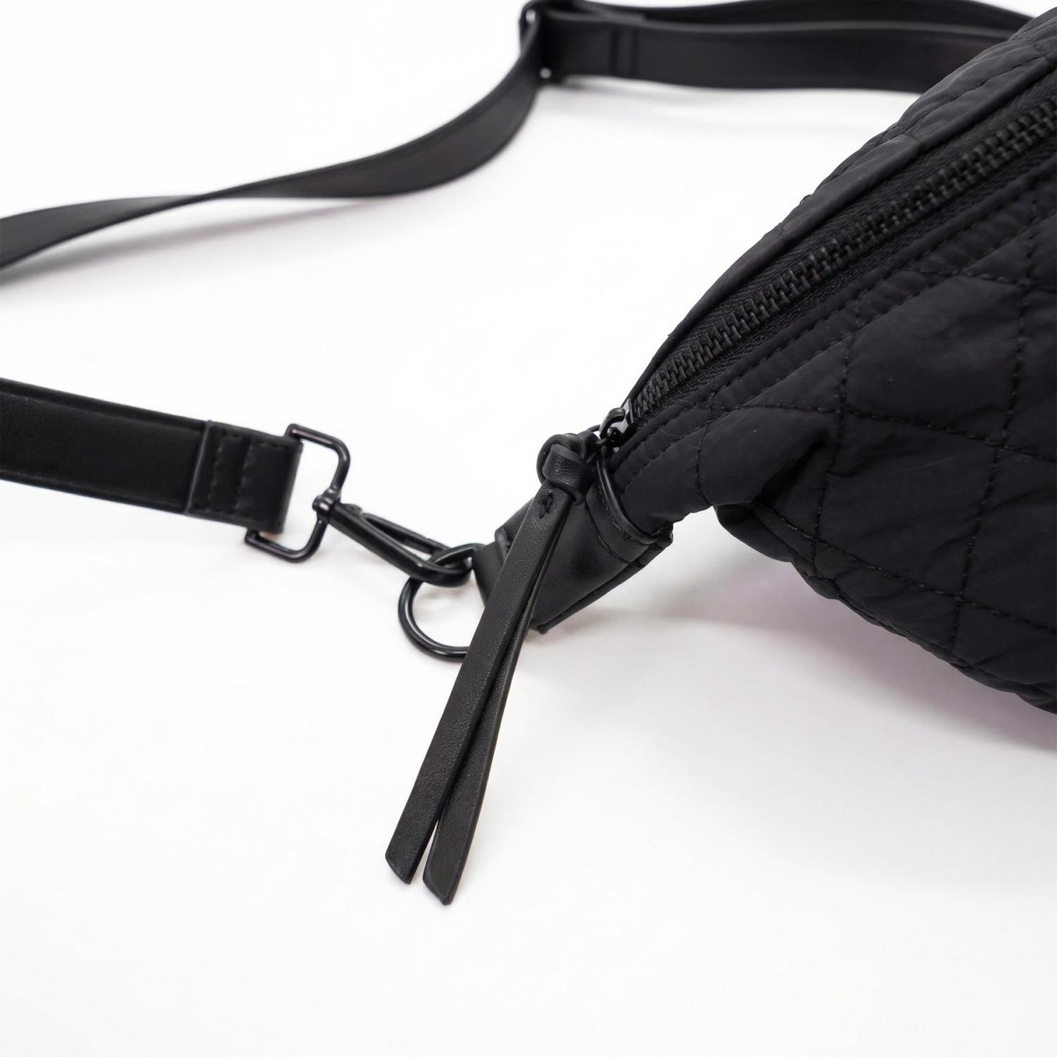 Compact carry with modern versatility. Crescent offers hands-free organization in a compact quilted silhouette designed for everyday essentials. Recycled Fabric Construction: 100% recycled nylon fabric outer shell with quilted design. Smart Organization: Built-in card slots for compact storage. Secure Storage: Internal and rear zipper pockets protect valuables. Compact Design: Quilted silhouette offers lightweight portability. 11.5000″ L x 3.7500″ W x 6.0000″ H