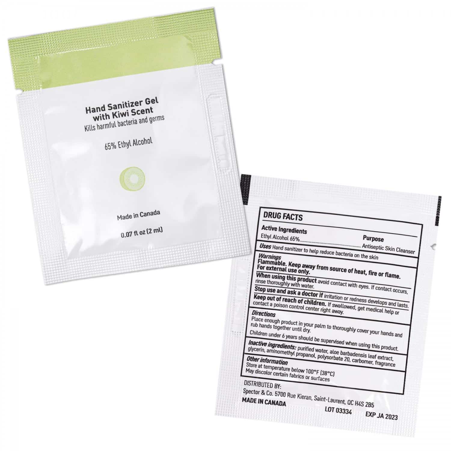 Personal hand hygiene with no more runny liquids or communal bottles!. . This single-use antibacterial cleanser in a refreshing and invigorating kiwi scent, contains less than 1% fragrance and is made from 98% plant and naturally derived ingredients. Its generously measured into 2 ml, easy to manage gel portions; the perfect size to amply cover all hand sizes. . . Customize to compliment your promotion. Choose from a small sleeve with 1, 2 or 3 packets, or a large sleeve with 2, 4 or 6 packets and then boldly brand your message on the sleeve in a full coverage, 4CP imprint. Default branding is on the exterior sleeve; the interior sleeve imprint is an available option.. . Each packet has an easy-tear, notched-top strip, so open it up and work this gel smoothly into your hands to help kill harmful bacteria and germs. Even with numerous hand cleansings throughout the day, dont worry about drying out your skin. The addition of moisturizing aloe vera extract will combat dryness to keep your. 2.75″ L x 8.5″ W x 1.5″ H